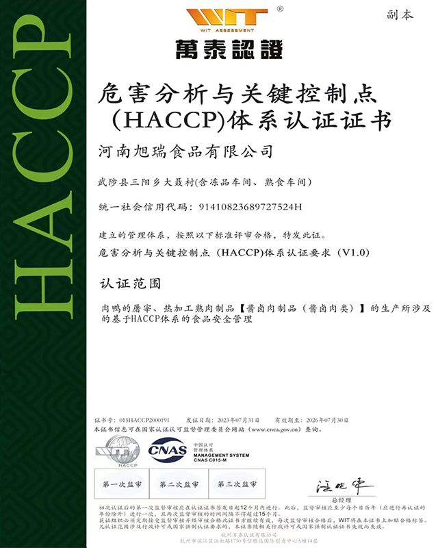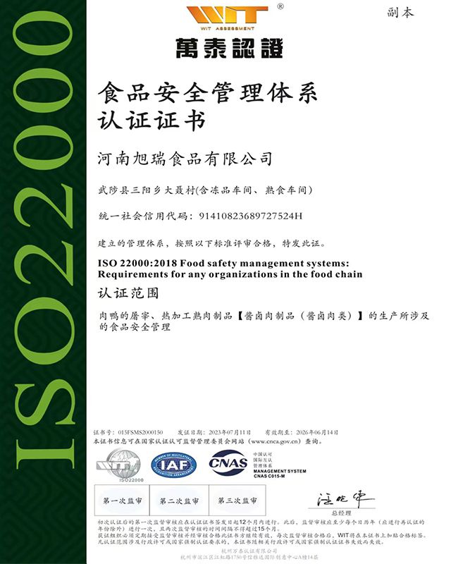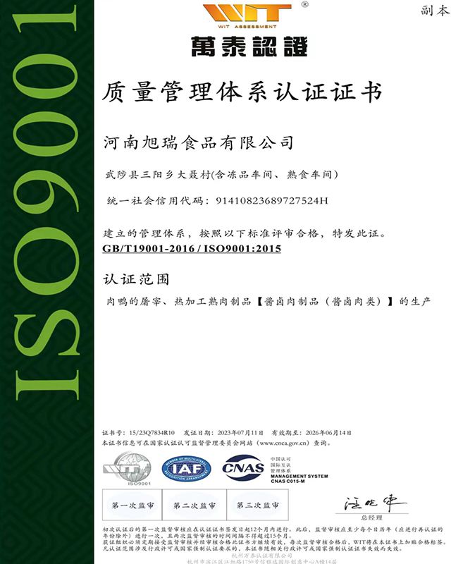 多宝(中国)累计投资1.5亿元,建成现代化屠宰加工生产基地,引进先进成套生产线,达到国内领先生产加工水平。具备年屠宰2000万只肉鸭生产能力。拥有储存量3000吨的智能化,数字化冷链仓储.产品分别通过ISO9001质量管理体系、ISO22000食品安全管理体系和HACCP管理体系认证,获得绿色食品认证和出口食品生产企业备案证明。